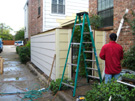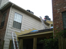 This picture shows one of the crew up on top of my roof, working on the new siding that is actually the facing part of my neighbor's roofline. You can also see the new siding that has been installed because of the new patio roof.