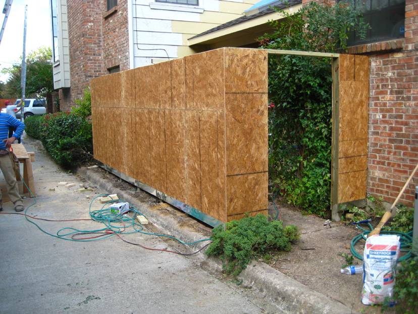 This is the last shot of the day, and the patio wall and gate are essentially complete. There is painting to do, of course, but they are going to wait on that until all the finish work inside the patio is done. But since this brings to a close the actual construction phase of the renovation, this will be the last picture I take until I take a set of the completed project. I'm told the windows will be another week or so, and so the crew will be leaving for a while until they are ready.