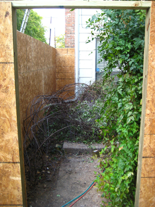 All of the outside boards have been removed, and you can see the structure of the fence. None of the studs you see were actually anchored in the ground. They sat on a 2x4 that stretched from the two corner posts which were anchored in the ground. But they were just buried in a small amount of cement, and twenty-five years had caused all that to deteriorate. You can also see how the Carolina Jasmine had sent vines actually inside the fence, working its way through the deteriorating siding boards.