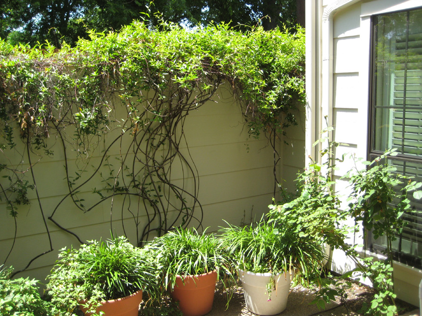 Finally, here is the southwest corner of the patio- the other end of the new wall from the first picture. The gate was installed quite nicely and it works fine. The Carolina Jasmine is making a good comeback; it is already much more full than it was when we put it back up in January.