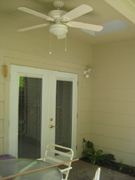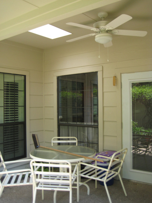 This is the front corner of the new covered patio area. You can see one of the skylights and the new ceiling fan. I have brought the patio furniture back out here, although it still needs a good cleaning.