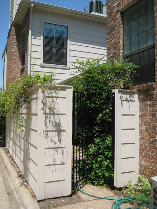 This last shot for today, I am looking through the gate opening into the patio, showing the other side of the fence. You can also see the jasmine and how it takes up a good portion of real estate inside the patio.