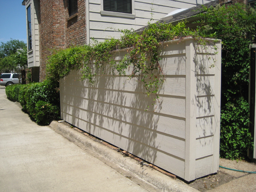 I volunteered at KERA this morning, and when I returned I found that the crew had finished the outside of the fence. Jack had them put some of that plastic housewrap material over the entire fence save for the bottom. I think it acts as a moisture barrier for the inside structure. Then they installed the HardyBoard panels- just like those on the house itself. They also did some of the trim work on the outside. Now they are working around by the gate and on the inside.