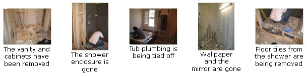 When the crew arrived they went right to work. Jack had a dumpster delivered and it was placed behind the garage. They carefully removed the shower enclosure and set it in the bedroom. They took out the vanity (separating it into the two pieces that it's made of) and stored that in the bedroom as well. And they made a lot of progress throughout the day removing wallpaper, cabinets and tile. By the end of the day they were working on getting the tub out. You can have a look at some candid pictures of this first day of demolition if you click on the thumbnails at right.