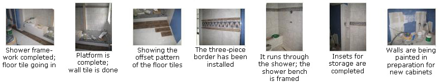 Well, four days later a lot has been done. It's Friday afternoon and we are well into the process of rebuilding the major elements of the master bath. Take a look at the pictures I took today by clicking on the thumbnails below and you will see what I mean: