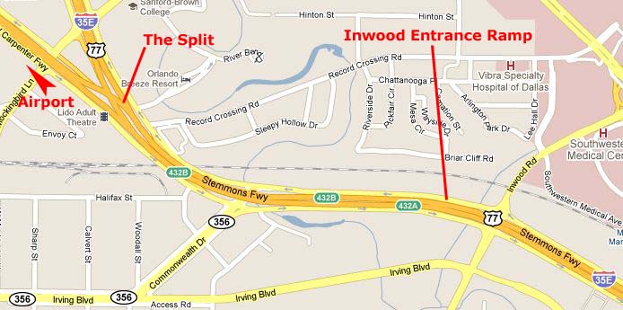 The stretch of Stemmons Freeway between Inwood and the I-35/Airport Freeway split can be a treacherous one; Fred and I have seen accidents- bad ones- occur here before. The problem is that drivers coming from downtown have to decide whether they want to continue on I-35 North or go towards the airport and Fort Worth. Cars in the fast lanes going to I-35 have to merge three lanes right; cars in the slower lanes wanting to go to the airport have to merge three lanes left. Even though drivers have plenty of warning, most seem to wait until the last minute to make their switches, and Fred and I have seen at least two bad accidents right near the split because drivers waited too long. It is trickier for those of us entering the expressway at Inwood. Once we have merged into the slowest lane from the onramp, we have only three-quarters of mile to merge left to head to the airport. That is what I was doing this Monday night; I was heading to the airport to pick up Steve and Mario who were returning from a trip to Florida.