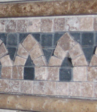 In its place will be a platform approximately six inches high, topped with the blue granite. The shower door will open out onto this platform. As I already said, the entire wall over and around this side of the window will be tiled from floor to ceiling. When I did the Florida bathroom, Ty and I put a border around the wall of blue glass tiles just a few inches high and about halfway up the wall to add interest. I did some searching at the tile store and found the pre-made border you can see at right. It comes in long strips so it is easy to install. We will put it about shoulder height all around the room and right through the shower. On top and bottom I found a curved, light brown border for the border, and the whole thing is in the picture at right.