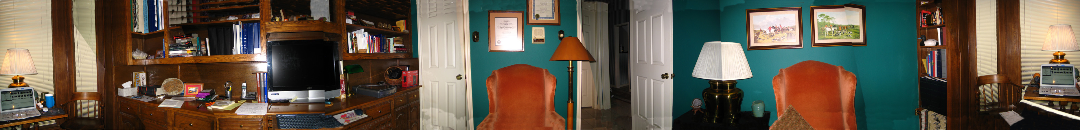 We were hanging out around the house this evening, and we were working on understanding the aspect ratios for Fred's new camera. I got the idea to create a panoramic, 360-degree view of the den (computer room). I am sure I could have gotten better results had I measured accurately, made the lighting uniform and used a tripod, but I just swiveled around the room, trying to keep my little camera at the same level, and took eight or nine pictures. Then, I used Photoshop to "stitch" them together into one long picture. The software had some difficulty, and the pictures didn't align quite right, so I had to adjust some of them manually. When I got that done, I found that the individual shots "walked" up (I didn't keep the camera exactly level, and so I did some retouching at the top of the left-hand side and the bottom of the right-hand side of the long strip picture. I didn't take my time here, so you will notice some inconsistencies.)