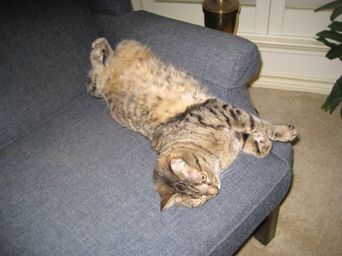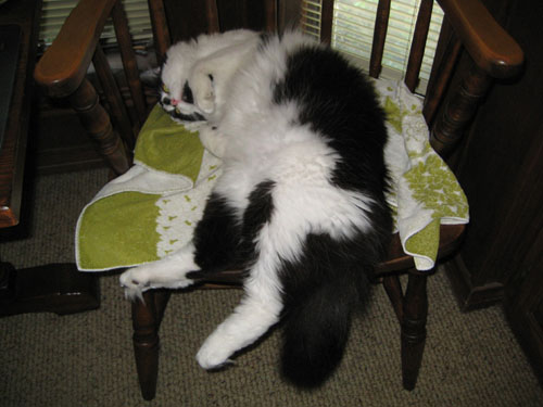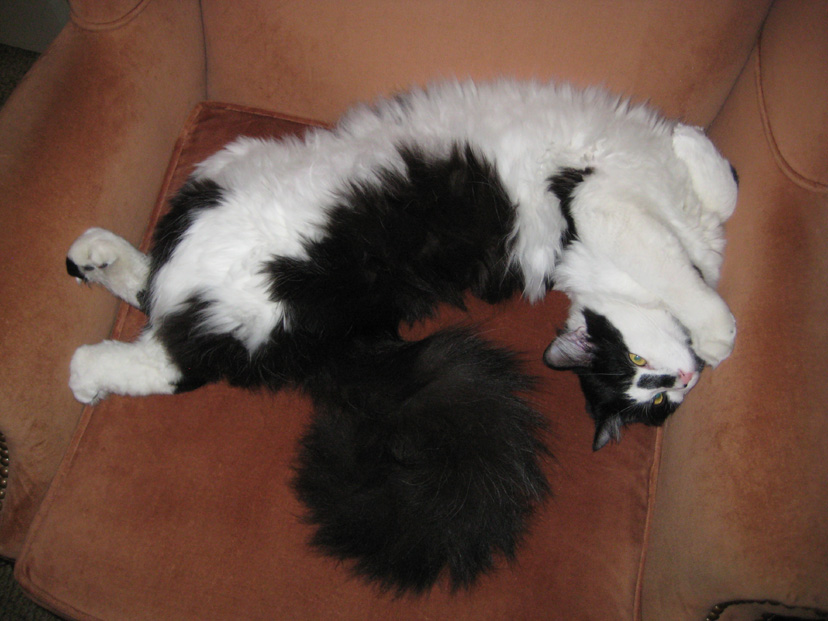 I guess all his exertions tuckered him out, for less than thirty minutes later he was falling asleep in the den chair in what seems to be one of his favorite positions- on his back, all stretched out with all four paws in the air. Usually, he is up against something when he sleeps this way.