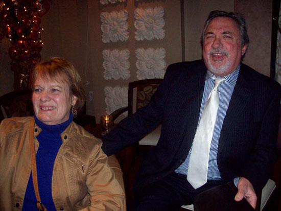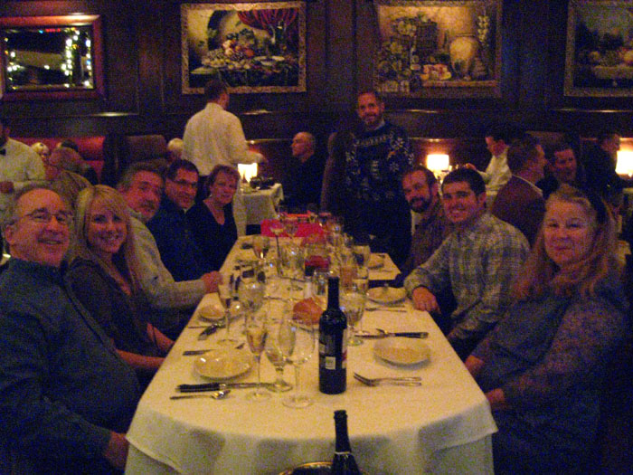 Before we got started with dinner, I had our waiter take a group photo. Perhaps I should have used the flash, but I very much dislike the way it bleaches everyone out in rooms that are otherwise very dimly lit, as this one was. So I just set the ISO very high and hoped for the best. I've noticed when I do that the the picture gets grainy, and I am not sure if there is another setting I should change, but you can see the result at left. I did the same thing with some of the other pictures I took this evening, so when you see a grainy image, that because of the high ISO I used to avoid the flash.