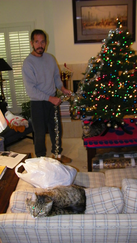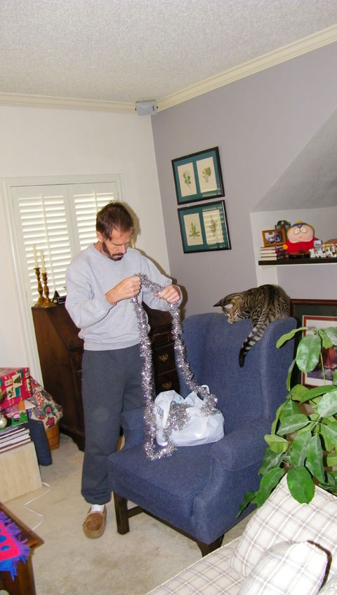 As I was finishing up the tree with the tinsel, Fred caught Bobbie Lee watching from her perch on the back of the couch, and also Tyger eying the tinsel from his own perch on the back of one of the wing chairs.