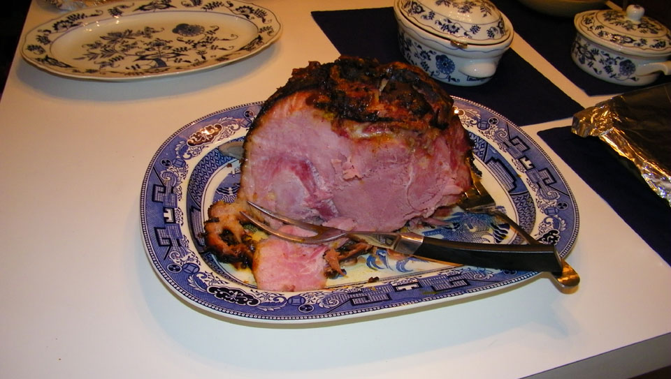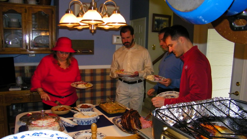 Paul and Greg were the last to arrive, and we all had a chance to relax and visit before we got the ham out of the oven and sliced. Mario brought a vegetable casserole, and we had baked apples, mashed potatoes, rolls and salad as well. We just set everything up in the kitchen and let everyone serve themselves.
