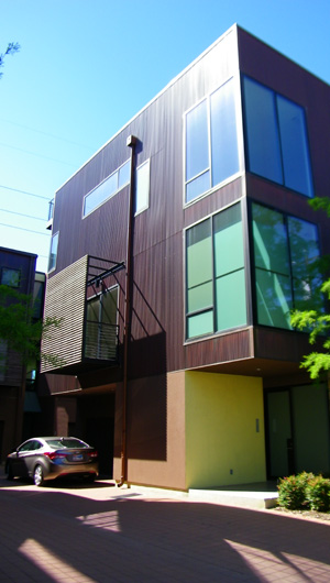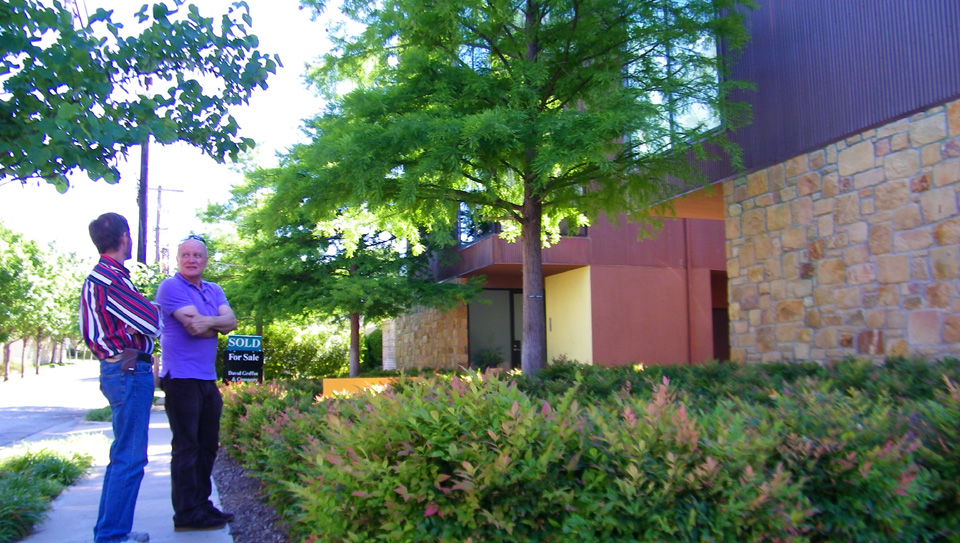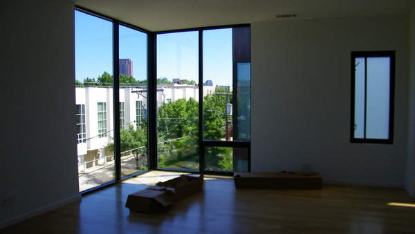 At the northeast corner of the building you can see the frosted glass windows that provide light for the stairs up from ground level and from the second floor to the third. While we are around by this corner, you can see a picture of Greg and I looking at the column of glass blocks that provide light for the ground floor bedroom, which is actually situated between the garage and the stairs up to the second floor. My only complaint about that bedroom is that it has no natural light other than what comes through the glass block, and while it makes sense from a security standpoint not to have a regular window there, for me the light isn't enough. Paul, the physical therapist who is Greg's roommate doesn't mind, though, and it will be he occupying the bedroom behind the glass blocks I am gesturing towards. (I was actually suggesting that the top half of the glass block column be replaced by clear glass.