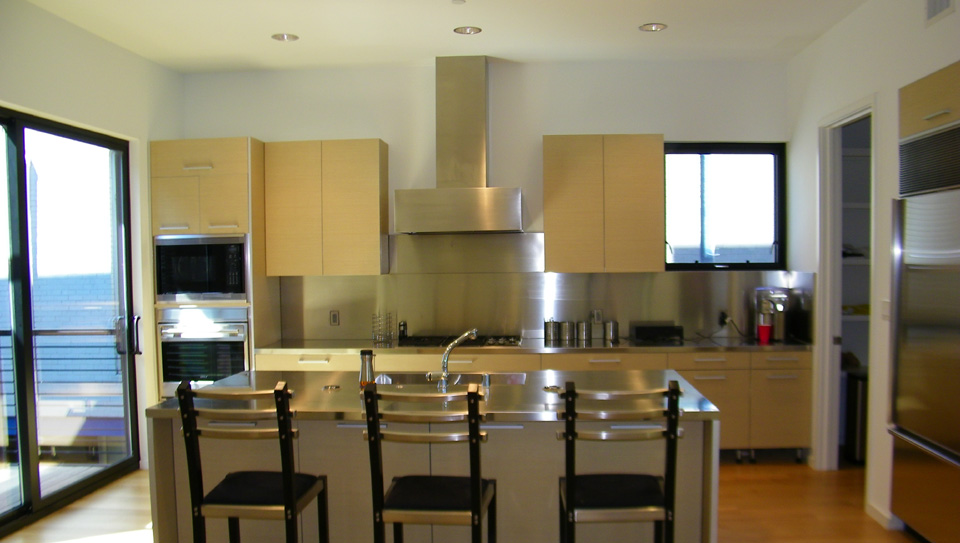 The northwest corner of the second floor is the kitchen and island- all high-tech and very modern. In the kitchen picture you can also see the glass doors leading to the west balcony. To the right in that kitchen picture are the utility room and pantry, A/C equipment and, accessed through a door next to the stairs, the powder room.