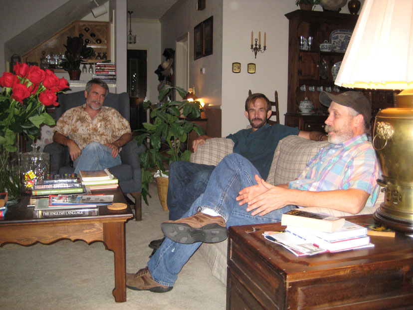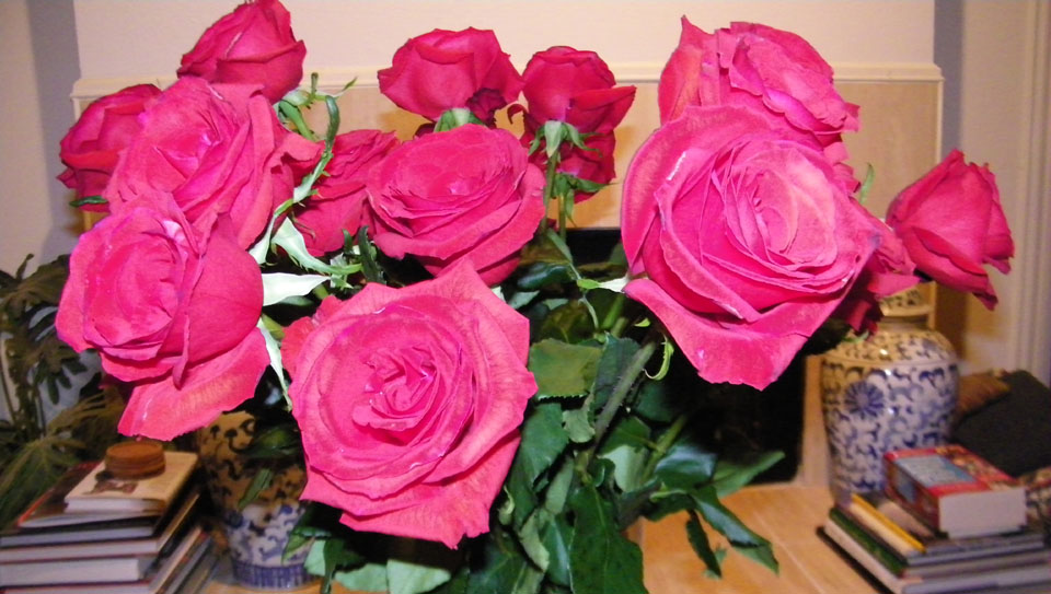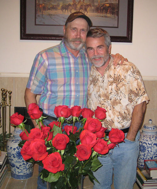 The guys surprised us greatly when they arrived with a huge bouquet of the largest red roses that I have ever seen! We got the biggest vase I could find, and even it was almost overwhelmed by these long-stemmed beauties. I thought it would be a nice idea to take them into the living room, and get Gary and Justin to pose behind them for a photo, and you can see the result at left.