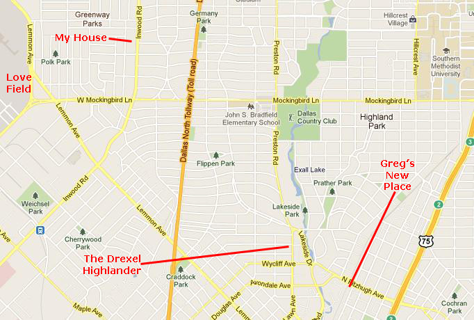 On the map at left, I've shown you where my house, the Drexel Highlander and Greg's new place are in relation to each other. Getting to the new place is only slightly longer than getting to the old, so for me to visit it is six of one and half dozen of the other.