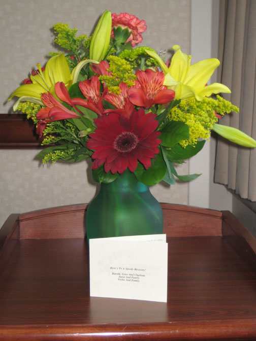 I did take some other miscellaneous pictures during Fred's recovery. He asked me to take a picture of his Aunt Charlotte's flowers that she sent after he'd been moved to a less-intensive room. He also took (and had me take) various pictures of the incisions, scars and other aspects of his surgery. Most of those pictures are a bit graphic for a photograph album, but I picked the least graphic of them just to record the fact that they were taken. You can see this rather mild picture here.