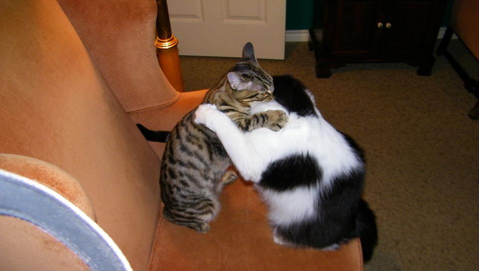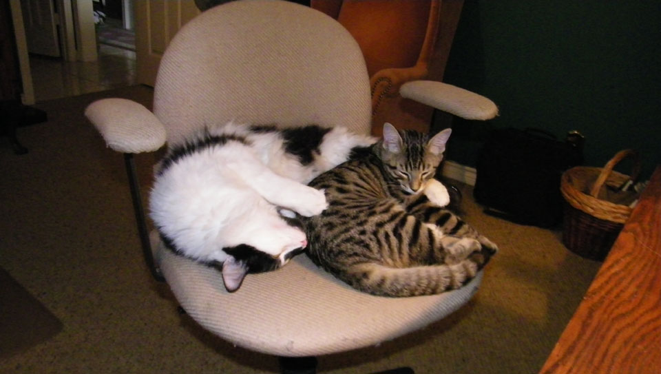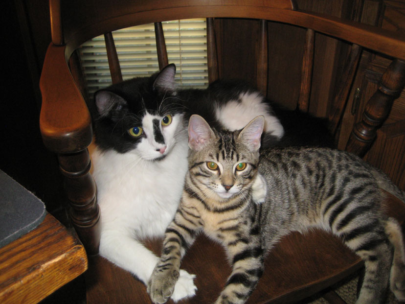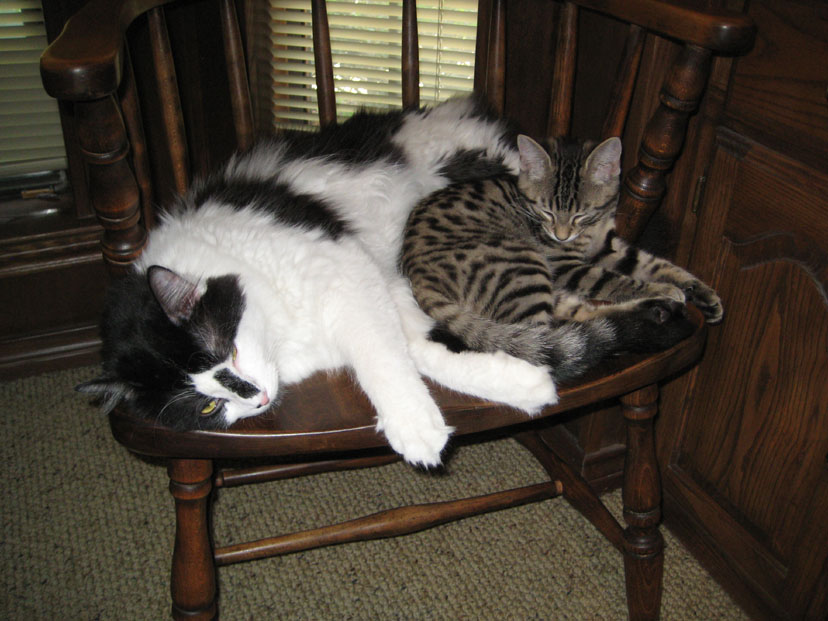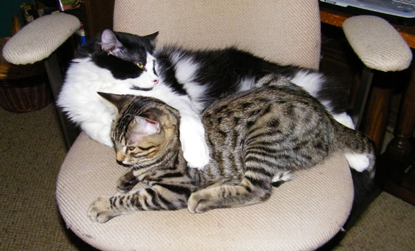 Lucky and Tyger seem to really have bonded, which is, of course, what we hoped they would do. From the first weeks when they just tolerated each other and were rarely together, they have become the best of playmates, and are together much more often than not. Tyger, being a kitten, still loves to play and Lucky, to his credit, it young enough at heart to participate wholeheartedly. In the two pictures Fred took of them this morning, you can see them all balled up in the chair next to me; just click on the thumbnails at left to view.