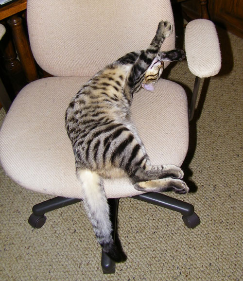 Lucky left for a while when naptime was over, and Tyger stretched out on the chair. I think the picture at left shows off his markings in good detail; he certainly seems interestingly-patterned, even for a tabby.