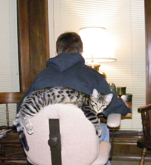 Lately, Tyger has taken to laying on the top of the back of my chair when I am using the laptop in the study. I can only suppose he is comfortable there, but until Fred happened to be in the room with his camera, I had no way to record Tyger's behavior. He will stay there for a short while- maybe a half hour at the most- and then climb around and get into my lap. It is nice to have a cat that is fond of sleeping in your lap and is small enough so that you can let him do so and still do what you are doing.