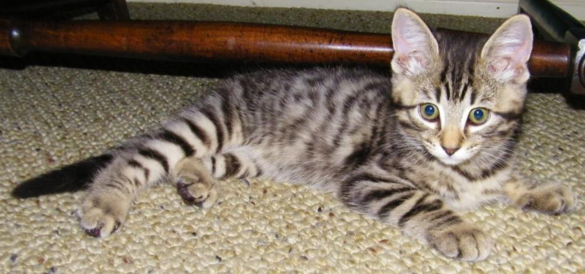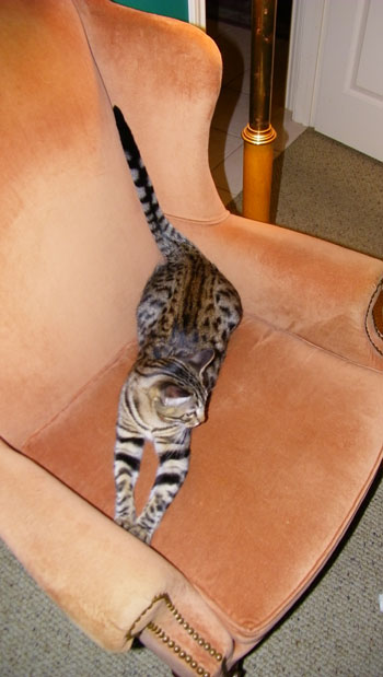When we returned, we found Lucky napping upstairs and Sierra curled up on the living room sofa. Even Bobbie Lee was wandering around. It seemed as if the first day's introductions had gone well. Our biggest problem was what to name the kitten. His name from the SPCA didn't seem to fit; Sierra struck me as a girl's name. So at first we tacked a "Mr." on front of it, but since Sierra is Spanish, we changed the "Mr." to "Senor." "Senor Sierra" was also more alliterative. Fred likes his cats to have three names, even if they aren't all used routinely, and so the kitten's markings led us to "Tyger," although from the photos we see on the Internet, the markings are more similar to those of an ocelot. Anyway, unless we find some reason to change it, he will be "Senor Sierra Tyger," or perhaps just "tiger" for short.