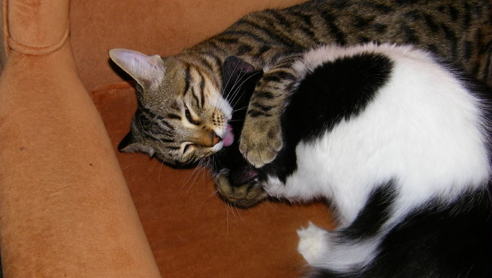 Cats do a lot of grooming, and one way you can tell whether one cat is comfortable with another is if that cat grooms the other or allows itself to be groomed. In this movie, you can see Lucky trying to help Tyger out with the places he can't reach. Tyger, though, is not quite sure if this is play or not.