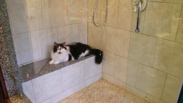 In fact, he seems to actually like the water now; he is always sticking his head under the faucet to get a drink and he often tries to push the shower door open to get in when he sees the water running. And if he is anywhere near the bathroom, we can count on him to come right in after we've finished and squeegeed the bench so he can jump up and lie down on it.