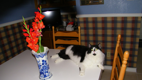 This weekend, Fred brought some Gladiolas down from his garden; they were the result of some plants that Steve gave him last year and which he was able to overwinter and plant this year. Lucky was particularly attracted to them (as he seems to be to most foliage we bring into the house). Fred usually has to put any cuttings he wants to save in the master bath shower and close the heavy glass door. This allows them to get some light while keeping both cats away from them.