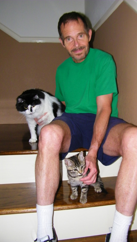 Actually, towards the end of the afternoon when Fred and I were going to head off to the gym for a while, I found the two of them on the stairs; neither was running from the other and there wasn't any spewing evident from Lucky. So I had Fred get his camera while I sat