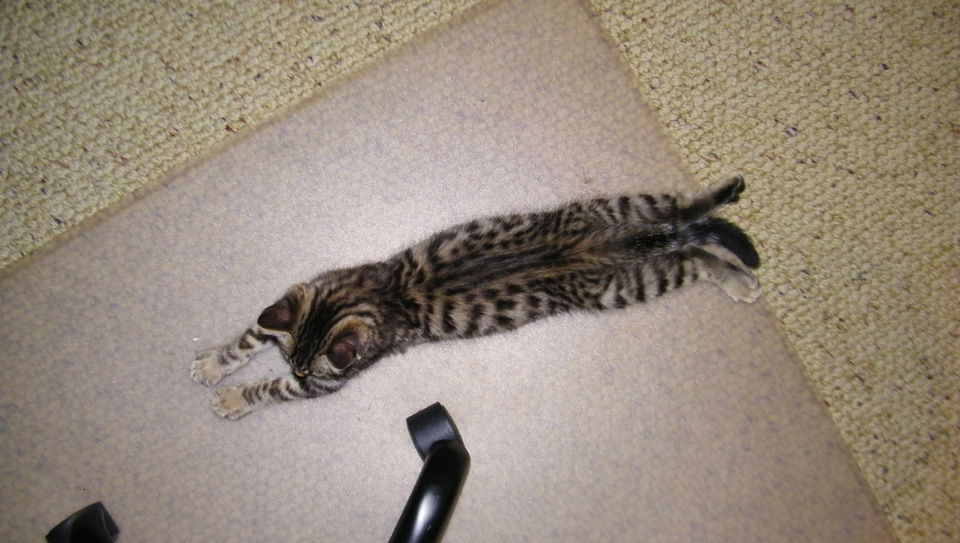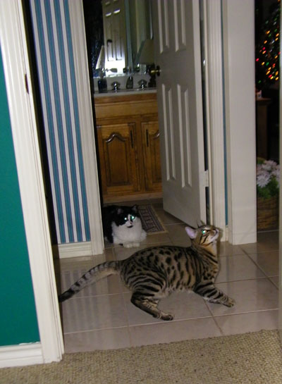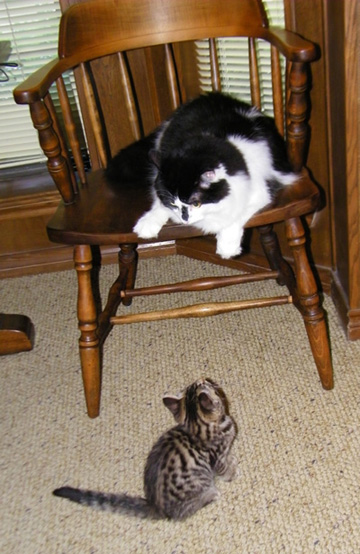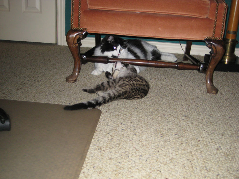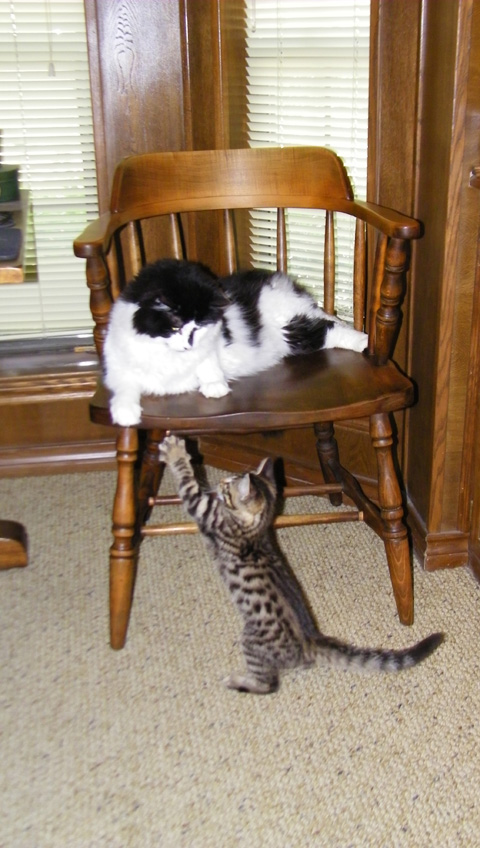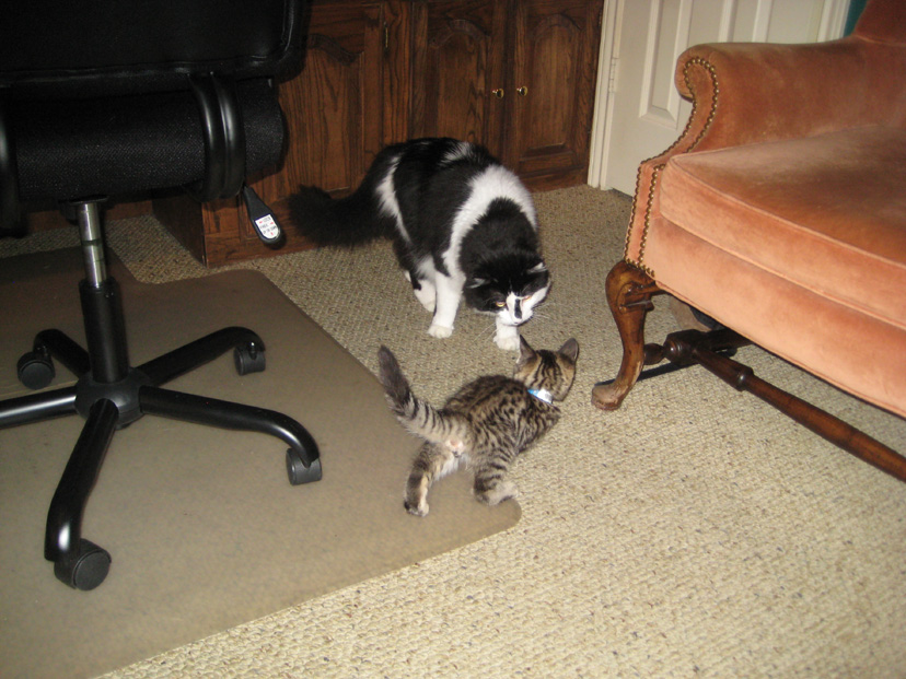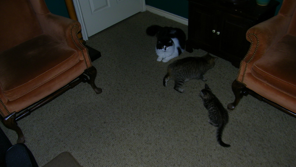 Well, this is the second day that Senor Sierra Tyger (just "Tyger" from now on) has been with us, and already both Lucky and Bobbie Lee seem to be getting used to him. After spewing some yesterday, Lucky seems to have gotten used to the kitten already; about the only thing he does is leave the room if he doesn't want to play or if the kitten is giving him a hard time. As far as Bobbie Lee goes, she still spews a little if the kitten gets too close, but she is more than willing to play with the laser mouse along with the kitten. All three of the cats seem comfortable to be in the study at the same time (although Bobbie Lee usually takes up residence under one of the chairs).