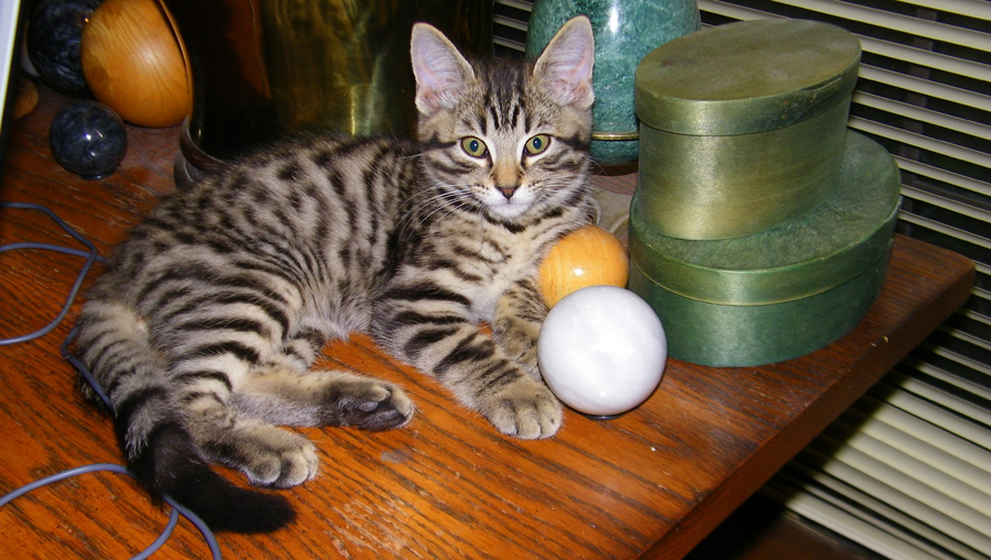 But also like most cats, kittens like to be up high occasionally, so Tyger will sometimes occupy a chair nearby or, it what may be becoming one of his preferred spots (until he gets to be too large for it) is on the table right behind my laptop: