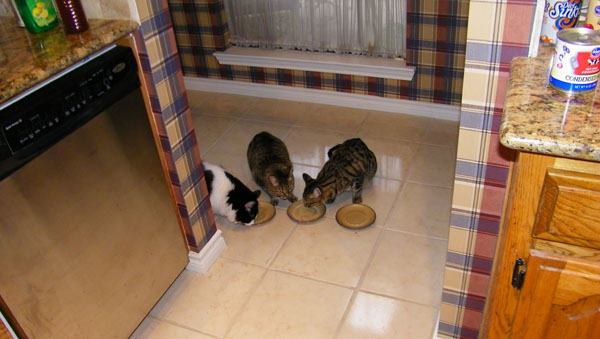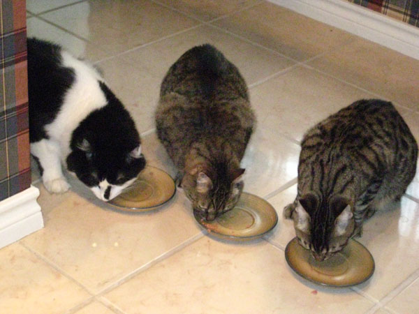 It's Christmas Eve (afternoon, actually) and I wanted to give the cats a treat, so I opened a fresh can of cat food and put out three plates, hoping to get all three cats in the same place at the same time so Fred and I could get pictures. We each got good ones, and in each of the pictures below we see (left to right) Lucky, Bobbie Lee and Tyger: