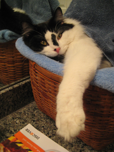 One of Lucky's favorite places to sleep, and one of the first places I look if I can't find him, is up in the master bathroom in the basket of towels that sits on the granite counter next to the mirror. Usually, he is all curled up on the towels, or underneath one that might happen to be draped over the top. That's where I found him this morning. He was totally asleep when I got up there, but by the time I'd returned with my camera, he'd at least partially awakened. In any event, the pictures I got were pretty cute, and you can have a look at them by clicking on the thumbnails below: