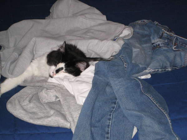 One of Lucky's most endearing habits is that if he has a choice on where to curl up for a nap, his first preference is to sleep on or among any clothes I might have just been wearing. I suppose it is all about the smells.
