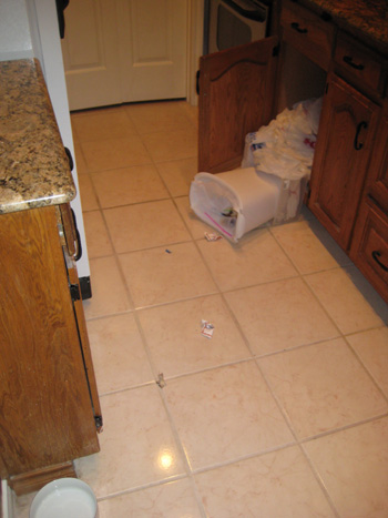 As Lucky is the only cat who seems to have figured out both the drawer-pull principle and the door-open principle, I can only assume that it was he who was trying to get at last night's chicken bones.