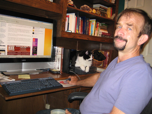 If he is playing with his toy drawer, he is also off to the side, but one of his favorite places is to sit on top of the scanner and look out at what's going on (which is usually Fred surfing and me working on my laptop). Fred got Lucky very early, so for a long as he can remember (I suppose) there have been people around, so he is not put off or scared by them. He is moderately inquisitive about other house visitors, but unlike some other cats, doesn't usually make a nuisance of himself. It is nice to have him nearby, and nicer still when he isn't in the way.