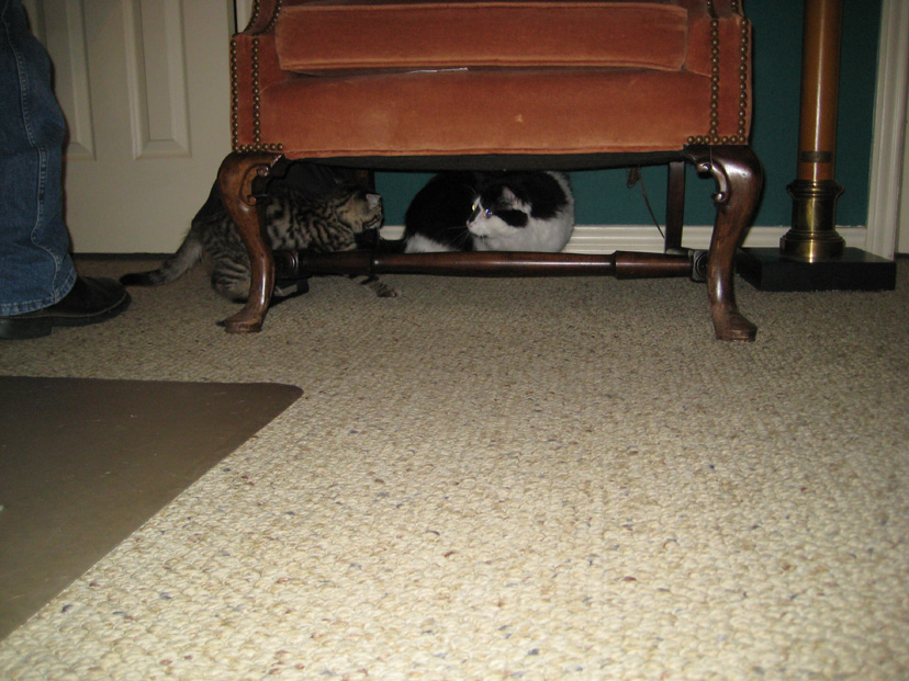 Lucky and Tyger playing under the chair.
