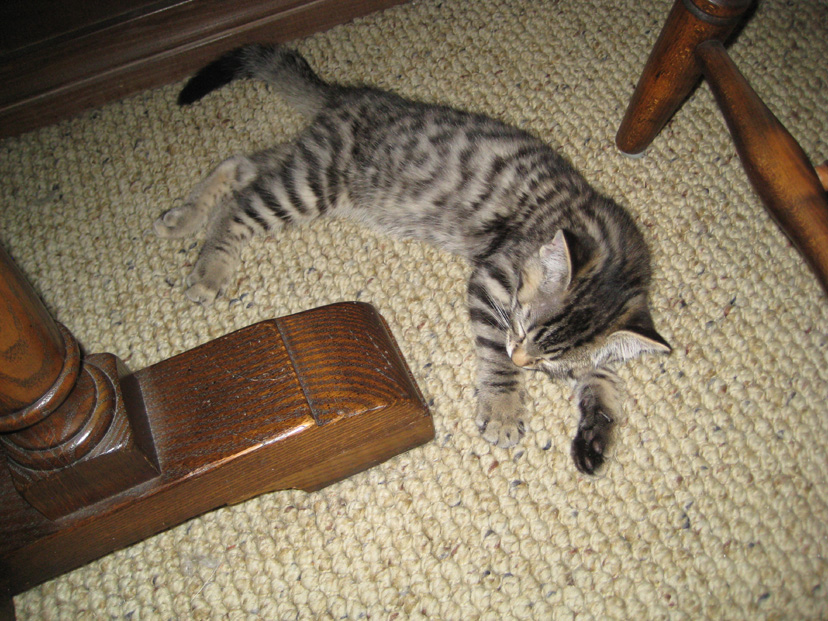 While I was taking the movies of Lucky and the kitten playing in the chair, Fred was snapping some still shots, and you can have a look at the three best of these by clicking on the thumbnails at left. Typical for a kitten (or any cat) are short bursts of activity followed by a nap. Lucky and Bobbie Lee have their favorite places for naps (depending on who is in the house), but Tyger seems to have, as yet, not selected such a place. He is as likely to