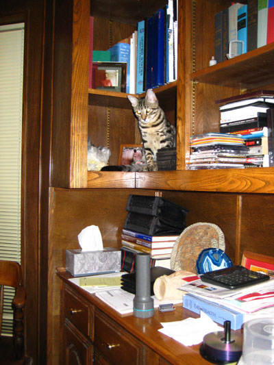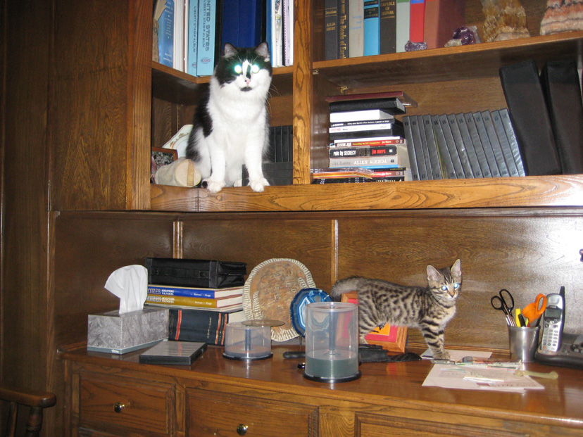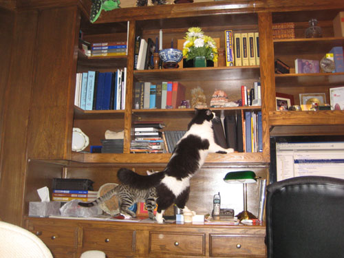 in close proximity. What got them together was the laser mouse, which Bobbie Lee just loves to chase around endlessly. It is one of the few things that actually gets her moving like a young cat again. And in a rather disturbing demonstration, Lucky showed us that he is capable of actually getting up onto the first shelf above the bookcase work surface; he can only do that because the shelf is inset and he has a place to stand to get up onto it. The higher shelves aren't inset any further, so I doubt he could climb higher. When he got up there, Tyger jumped up onto the work surface, and I got a picture of