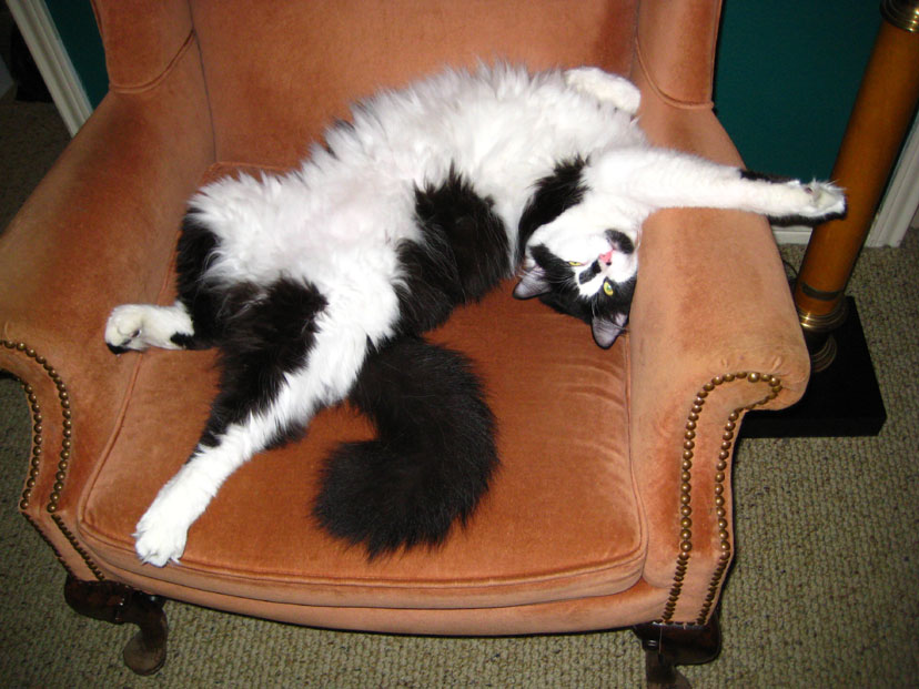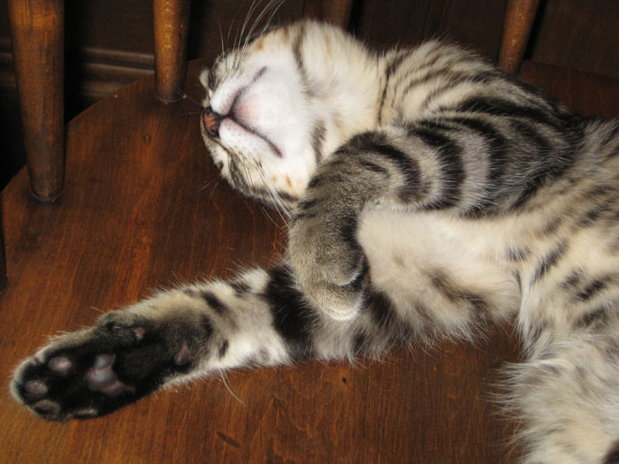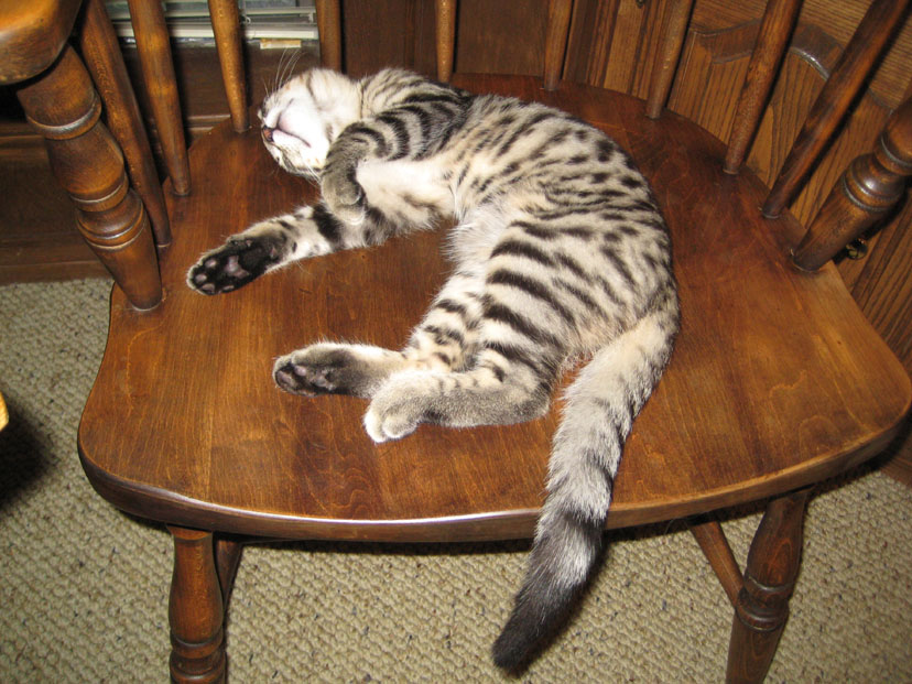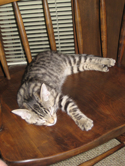 There was no particular reason for me to take this picture of Tyger this morning, except that he looked so darned cute sleeping there in the chair, legs all akimbo. If you want to see all of him, just click