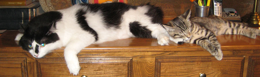 This was a real interesting pose, with both Lucky and Tyger up on the desk, stretched out and sleepy at the same time. I'll pan back and forth so you can see what I mean. A bit later, though, they were