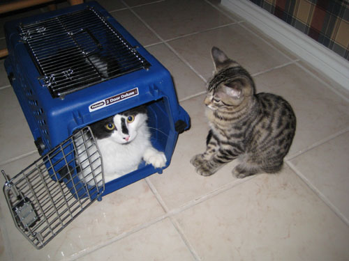 You might remember from our trip to Florida with Tyger that he never got used to the carrier- and meowed continually when put in it (so loudly and for so long that we eventually had to take him out of it). I happened to walk into the kitchen this morning where the carrier was sitting on the floor, and it looked to me as if Tyger had asked Lucky about this "cage thing," and Lucky got inside to show him that it was no big deal. (Lucky is quite used to the carrier and Fred tells me that when he uses it to take Lucky up to Van Alstyne, the cat just goes right into it, curls up and dozes all the way.)