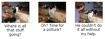 I was surprised to find Lucky in the kitchen, perched on the counter above the workarea- just watching. He was, I guess, intrigued by all the goings-on. It made for some interesting pictures. Just click on the thumbnails at right to have a look at them.