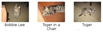 Building on yesterday's success in getting all three cats in the same place at the same time, today, just before we were going out to lunch with some friends, we again got all three cats together. I was sitting in the chair in the living room corner and, as she often does when I am by myself, Bobbie Lee joined me and sat on the footstool to have her head rubbed. Then Lucky came in and was nice enough to leave her alone and climb up on the chair next to me. Finally, not wanting to be left out, Tyger came in to play with his cat toy (instead of Lucky or Bobbie Lee), and Fred snapped the picture at left and a few other shots as well. You can have a look at these by clicking on the thumbnail images below: