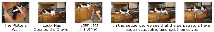 We had a chance this morning to watch Lucky and Tyger working together to achieve their goals. The morning started out with both of them in sleep mode, together in one of the reading chairs in the study. When they awoke, Lucky took Tyger over to the desk and actually opened the toy drawer for him so he could get out a mouse and his favorite string. However, the collaborators must have had a disagreement on division of labor or spoils, and their partnership fell apart and they started squabbling. You can see this sequence of events if you click on the thumbnails below: