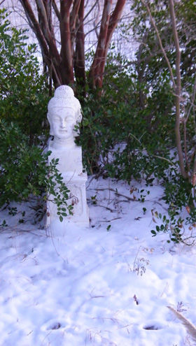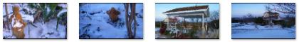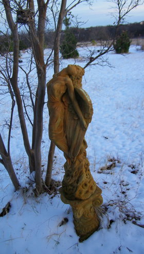 When Fred got home after Christmas, he found that Van Alstyne had gotten more snow than the city did (which is not unusual) and that it was also colder, so the snow was lasting longer. Below are two pictures that Fred took of some of his statuary amid the clumps of snow, and beside them are a group of clickable thumbnails for some of the pictures he took around his property.