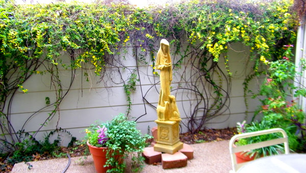 Some time ago, on the way back from San Antonio, we stopped at "Dirty Birds," a place on I-35 that sells unfinished concrete outdoor sculptures. Fred bought a tall, thin statue of St. Thomas Aquinas, and took it up to Van Alstyne to finish and stain. He has just brought it down here as a gift for me to put on the patio, and we have just now placed it by the outer wall. It is really a pretty statue, and you can see a close-up of it