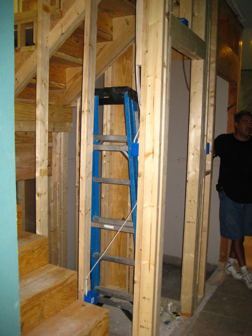 That is exactly what Kevin actually did, and today he has invited Fred and I over to see the work in progress. I am interested in the project not for myself, necessarily, but perhaps for Prudence and Ron. If, as they plan, they wind down Ruckman Haus in the next few years and move into their house, an elevator might become an extremely nice convenience, and I wanted to see the mechanics and how they are installed.