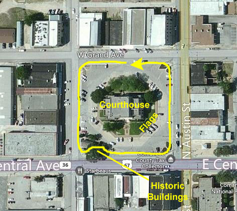 Comanche is a typical Texas small town; Fred and I have driven through quite a few of them over the years. Most of these small towns were laid out on a grid, that practice having to do with how land was allocated in the nineteenth century. If not at the outset, certainly later on, most of these towns had a crossroad in the center, so that roads could lead out in all directions to the farms and homesteads that clustered around these towns. Another standard aspect is the siting of the courthouse/city hall right in the center of town, usually in the middle of a block reserved for that purpose.