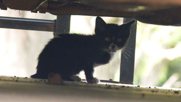 On Friday morning, I waited for a call from Fred to tell me he was ready to be picked up, and when he did call, I checked out and drove back to his Mother's house to collect him. Fred contributed a couple of pictures that he took at his Mom's house of a little tuxedo cat kitten that hangs around there. The cat is impossible to get close to, so Fred had to settle for some pictures like these: